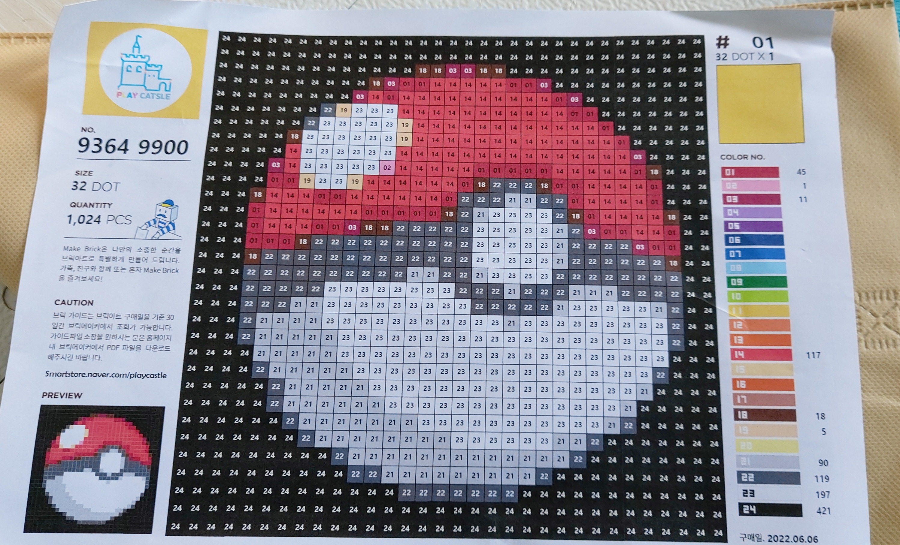 큼직하고 도안이 비교적 쉬운 포켓몬볼 도안으로 골랐어요. 브릭아트 일반 32사이즈입니다.