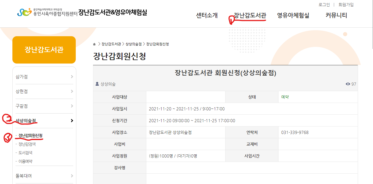 용인시육아종합지원센터에 들어가셔서 장난감도서관 클릭, 상상의숲점 클릭, 장난감회원신청을 클릭하시고