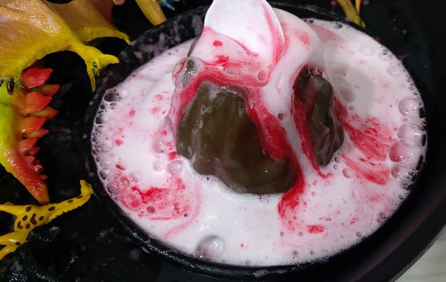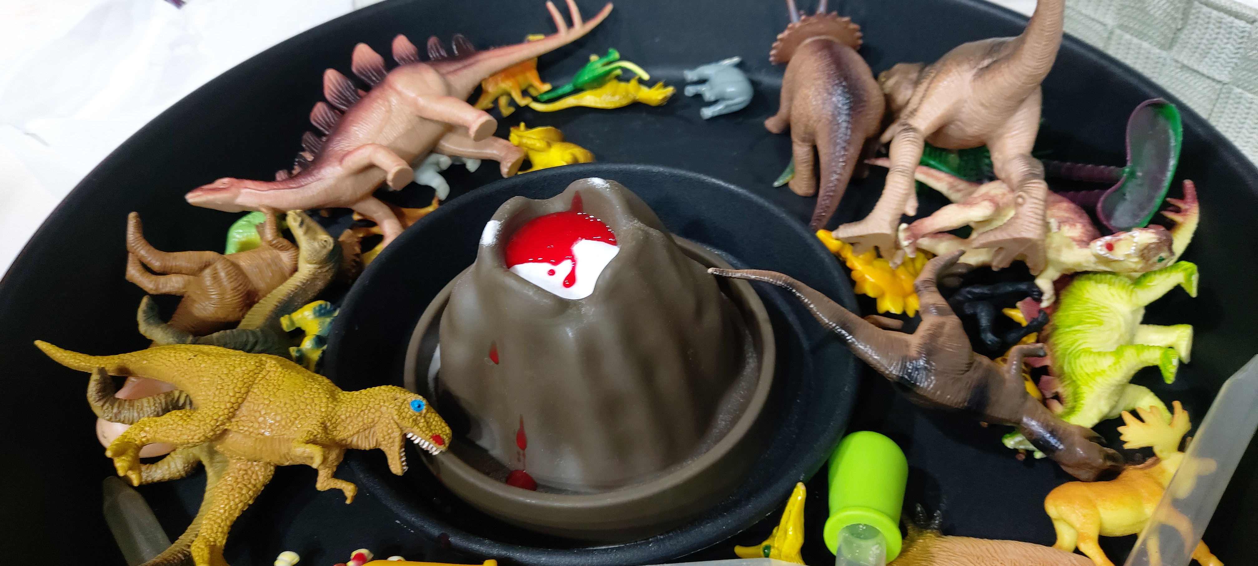 <준비물: 요구르트병 1개, 쟁반, 여러가지 공룡인형, 소다, 주방세제, 식초, 물감>