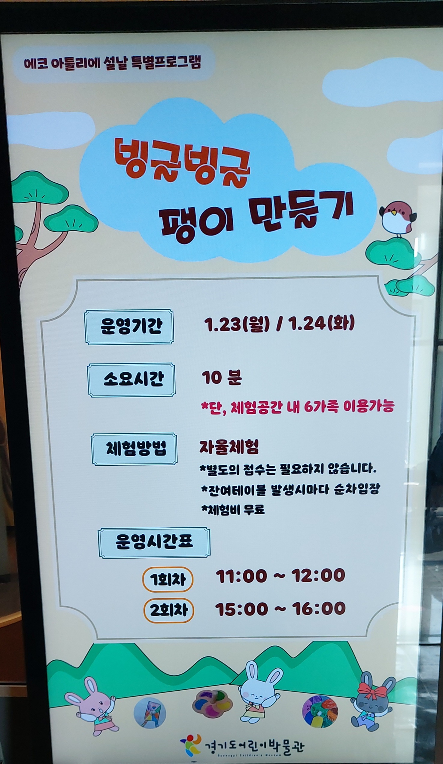 에코 아틀리에는 프로그램이 계속 바뀌는 것 같아요. 오늘은 설날을 맞아 팽이만들기 체험이 있네요. 그때그때 다양한 프로그램 체험이 운영되니 참고하셔요.