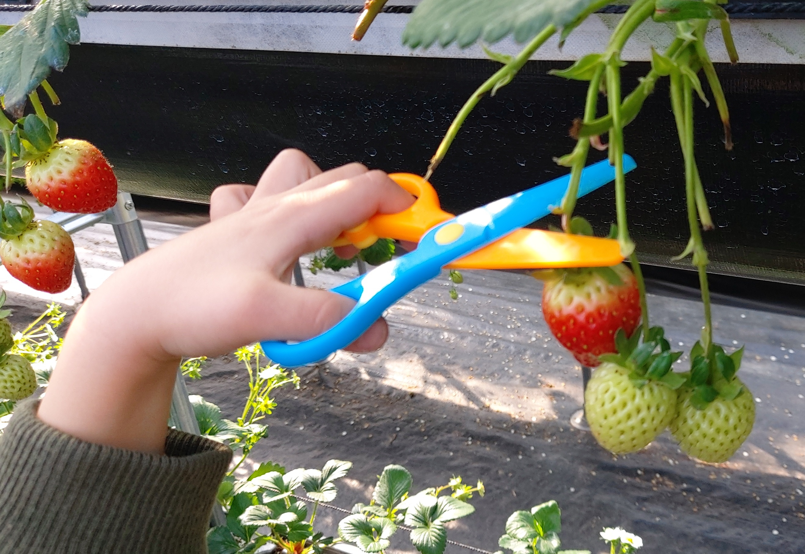 가위와 컵을 나눠주시며 마음껏 딸기를 따보라고 하십니다.