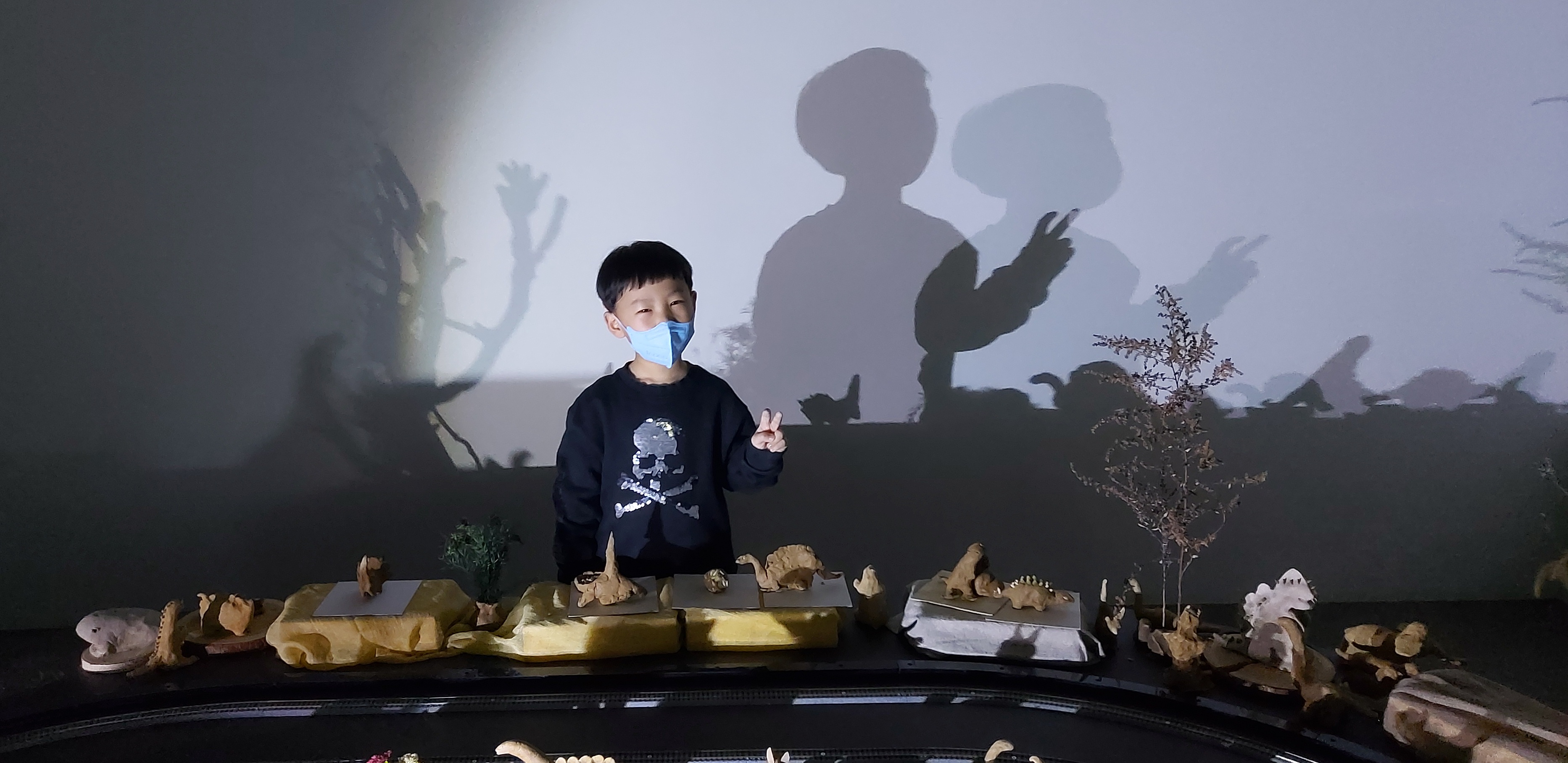 내가 만든 공룡이 그림자로 표현되는 세계를 경험합니다. 기차 레일 위에 작품을 올려두고 그림자로 만나봅니다.