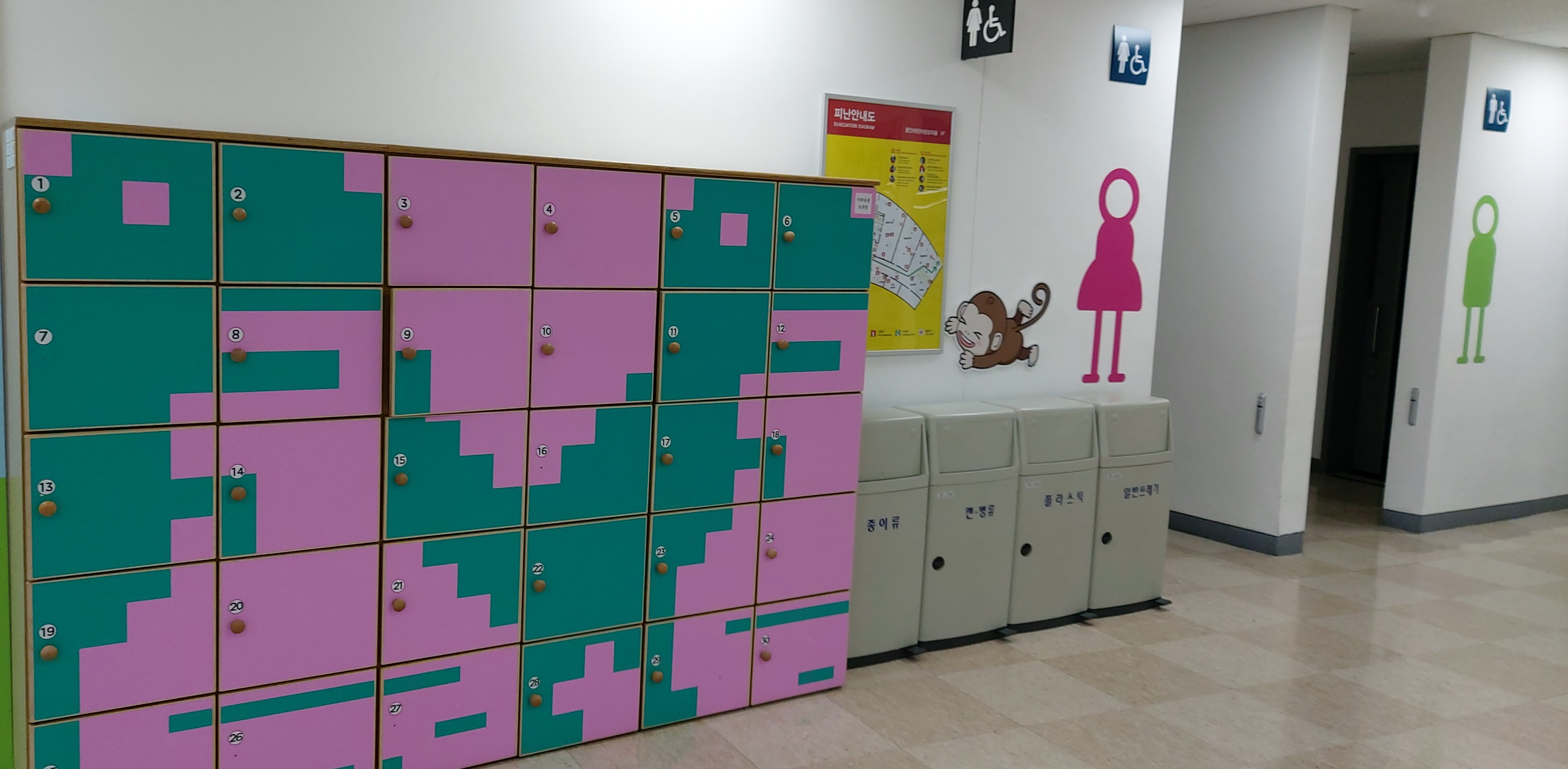 역시 1층, 지하1층에 사물함이 곳곳에 있습니다. 무거운 짐이나 외투를 들고 다니지 마시고 사물함에 보관하세요.
