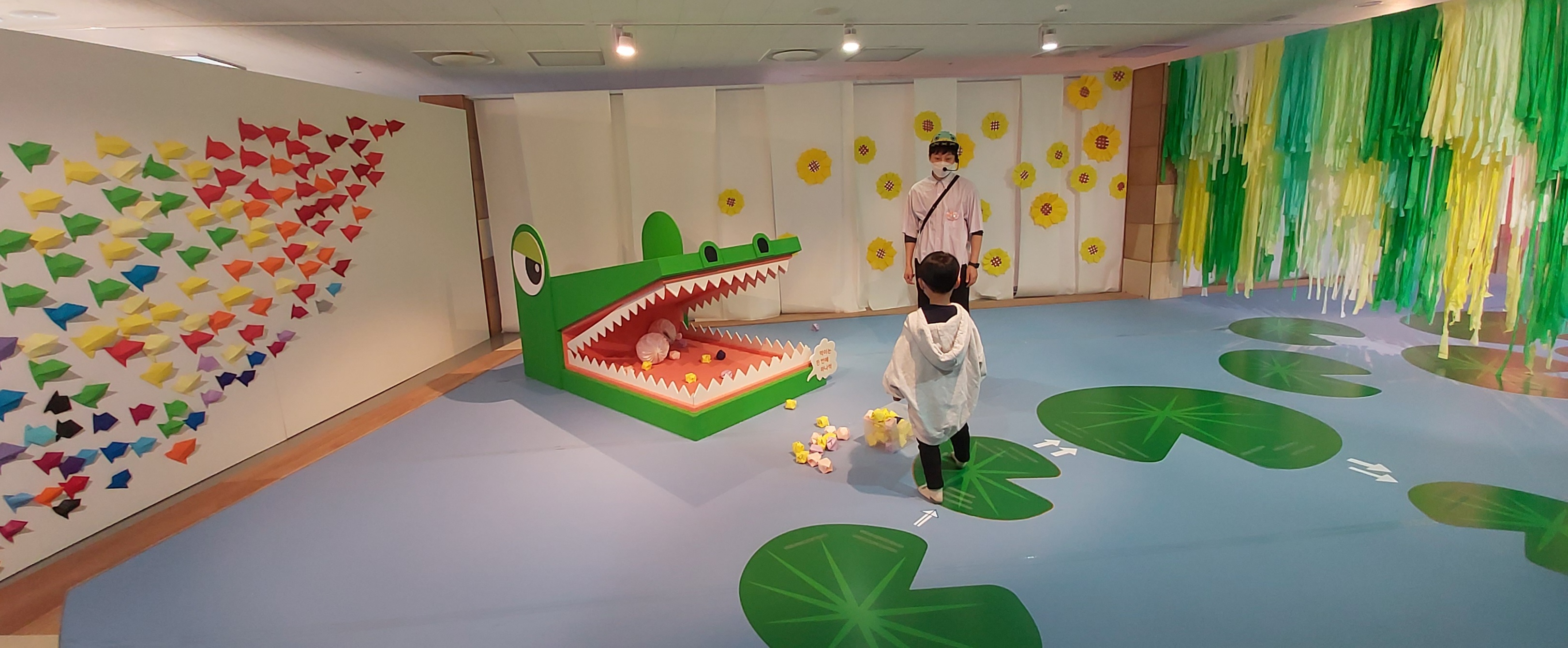 악어 입에 종이 먹이를 던져 주기도 하고, 여러 종이 접기를 체험해 볼 수 있습니다.