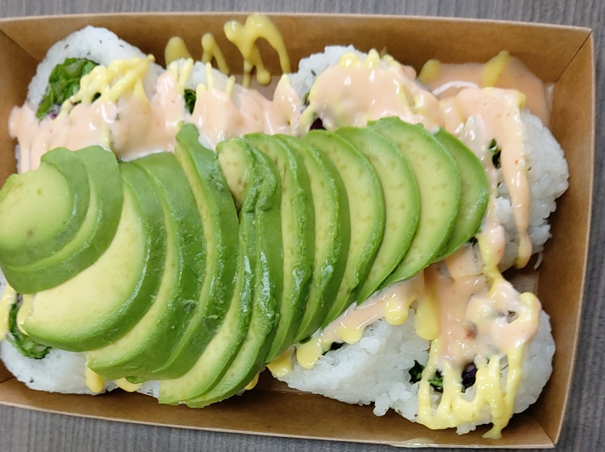 아보카도, 믹스야채, 게맛살, 오이, 머스타드소스, 스파이시마요소스가 들어있습니다.