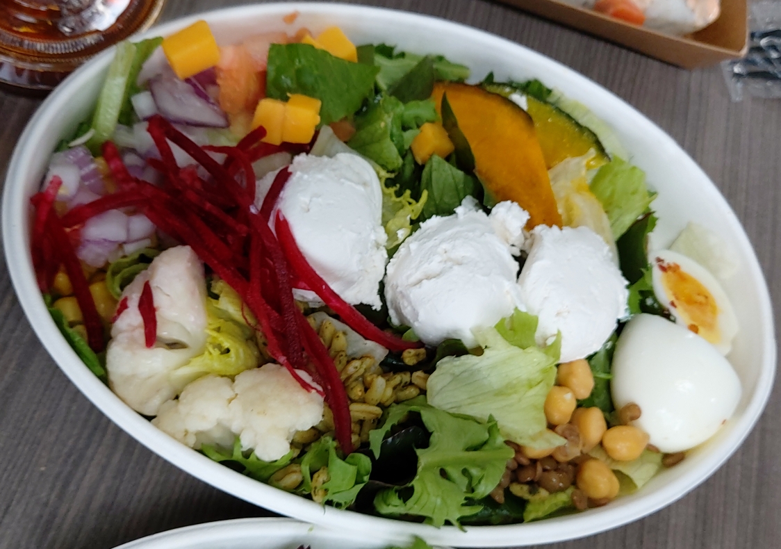 샐러드믹스, 병아리콩, 렌틸콩, 스위트콘 컬리, 바질카무트, 적양파, 토마토, 비트, 치즈, 계란, 레드페퍼, 단호박, 올리브, 빵, 후무스, 그릴드닭가슴살, 망고드레싱이 들어가 있습니다.