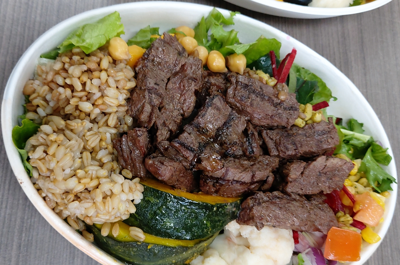 믹스야채, 병아리콩, 렌틸콩, 스위트콘, 컬리, 바질카무트, 적양파, 토마토, 비트, 치즈, 단호박, 믹스그레인,안창스테이크, 치포틀레드레싱이 들어가 있습니다.