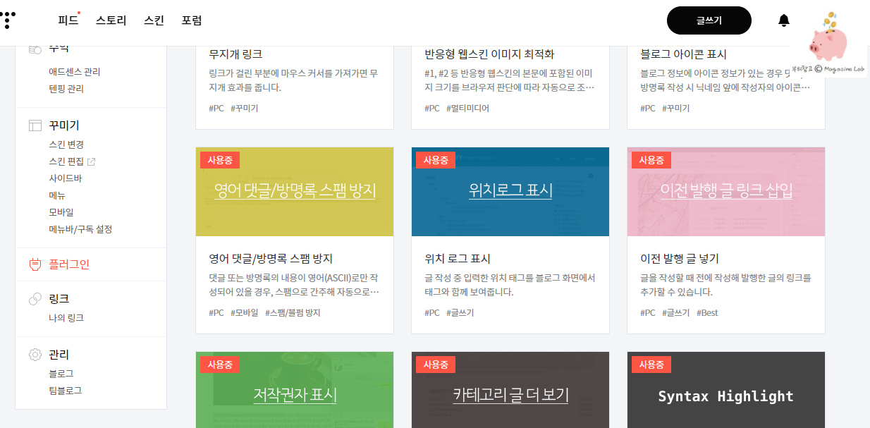 플로그인은 티스토리의 부가기능을 모아 놓은 것인데, 클릭을 하나씩 해보시면 나한테 필요한 부가기능들이 있으므로 적용을 하시면 됩니다. 저는 저작권표시나 유튜브 영상 삽입, 블로그 아이콘 삽입, 마우스 오른쪽 클릭 방지 등을 사용중입니다.