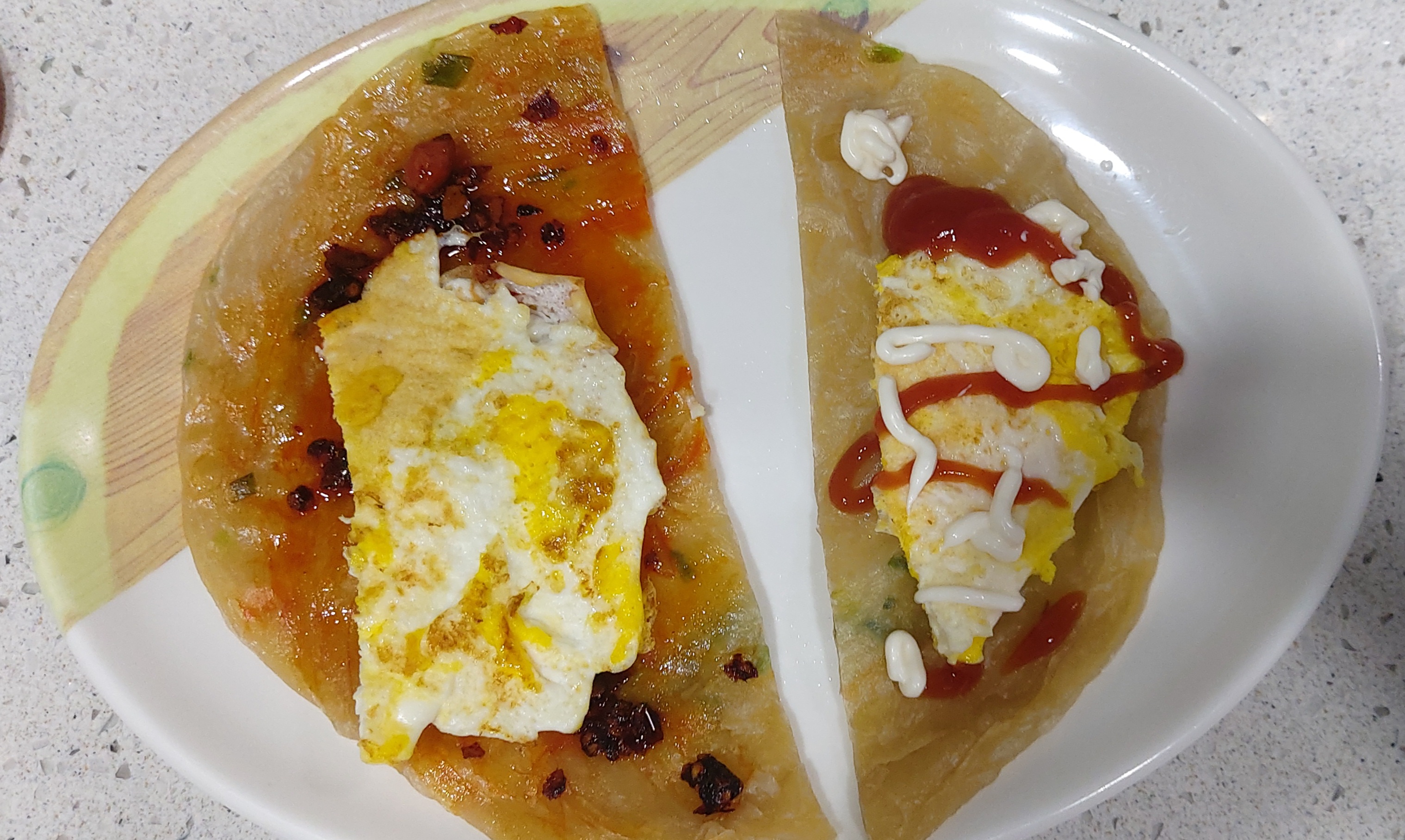 한쪽은 제것, 다른 한 쪽은 아들 주려고 케찹과 마요네즈 발라줍니다.