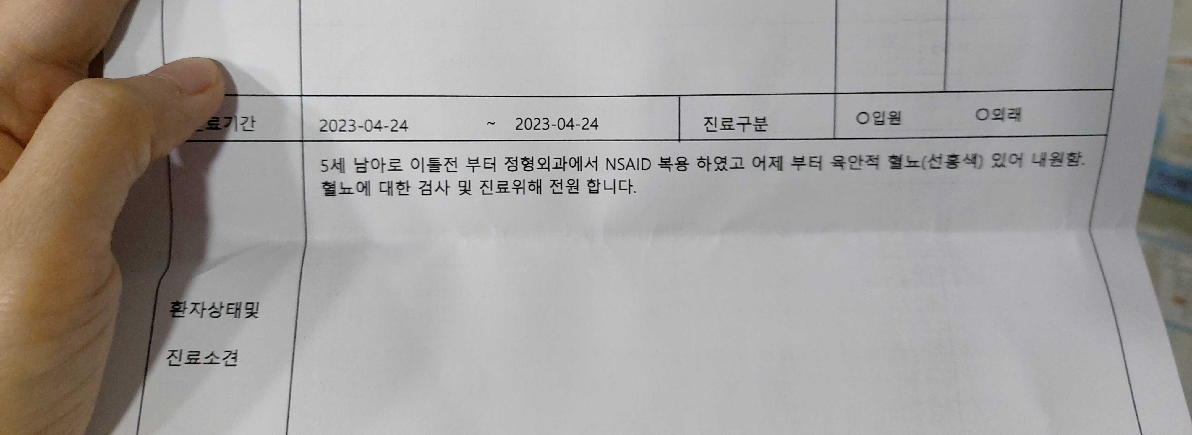 그리고 선생님께 얼마 전에 손을 다쳐서 정형외과에서 치료를 받았고 소염진통제를 처방받아서 먹인적이 있다고 말씀드렸습니다. 그게 전문용어로 NSAID인가보네요. 이것도 혈뇨를 유발할 수 있다고 하더라고요. 그래서 그 내용으로 진료소견서를 써주셨고 대형병원에 갈 때 지참하라고 말씀하셨습니다.