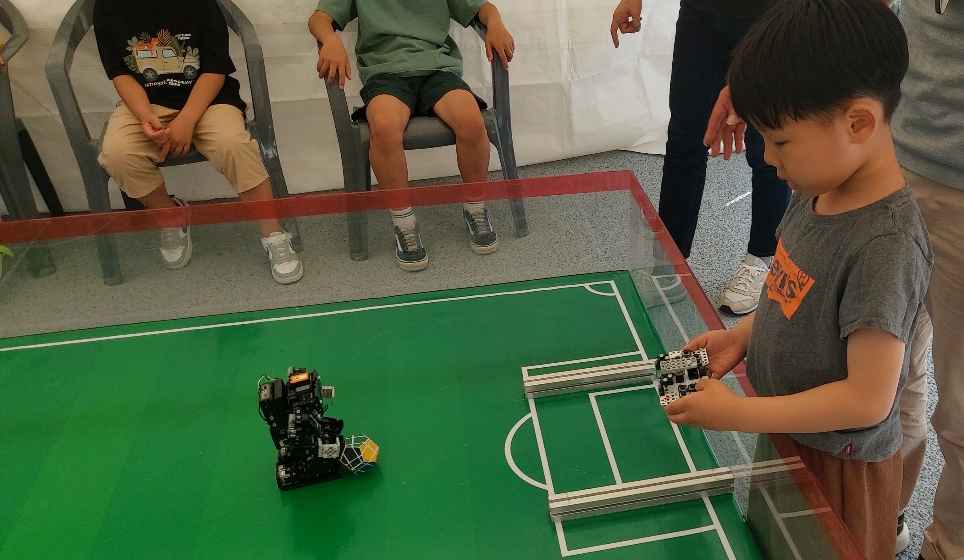 로봇을 조종하여 공을 굴려 골인시키는 체험입니다.