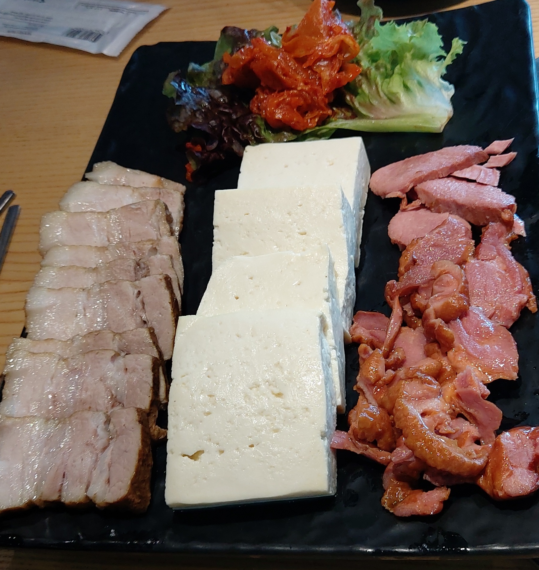 오리, 수육과 두부, 볶음김치가 나오네요.