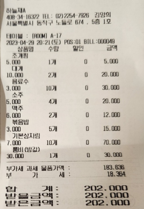 하늘채에 지불한 영수증입니다. 각종 조리 비용과 상차림비 등을 포함한 가격입니다.