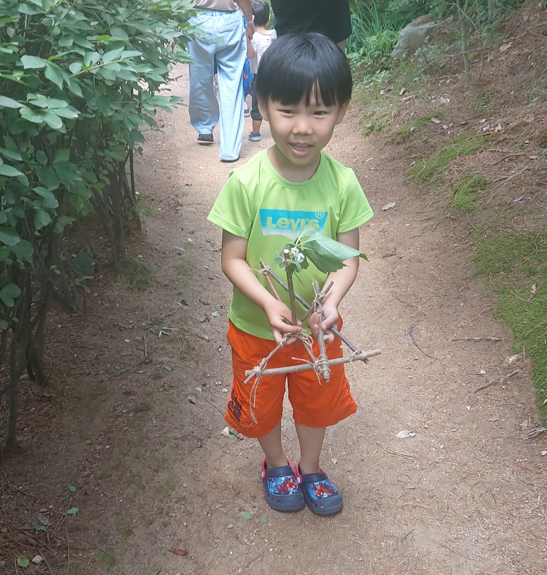 선생님의 설명을 듣고 주변에 놓여진 나무막대기와 여러 식물들을 이용해 돛배를 부모님과 만듭니다.
