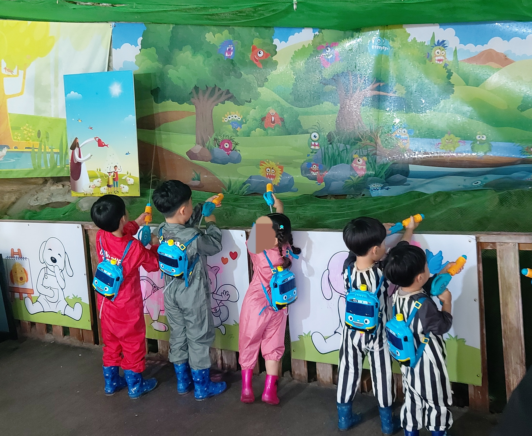 자동차부터 가전제품 등 다양한 물건에 물감놀이도 하고, 물총놀이도 합니다.