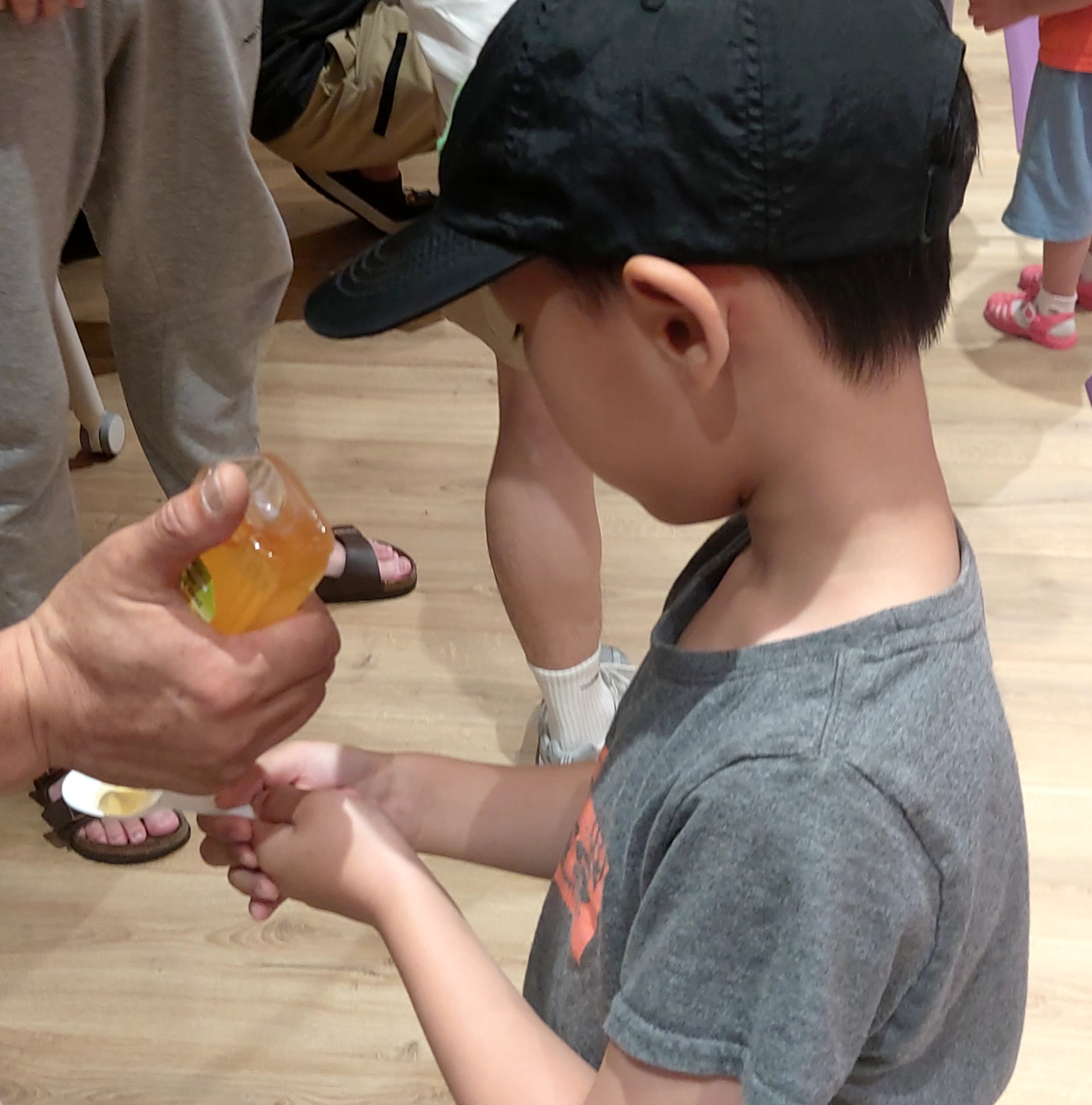 양봉 모자를 쓰고 꿀을 걸러내는 과정을 체험해봅니다
