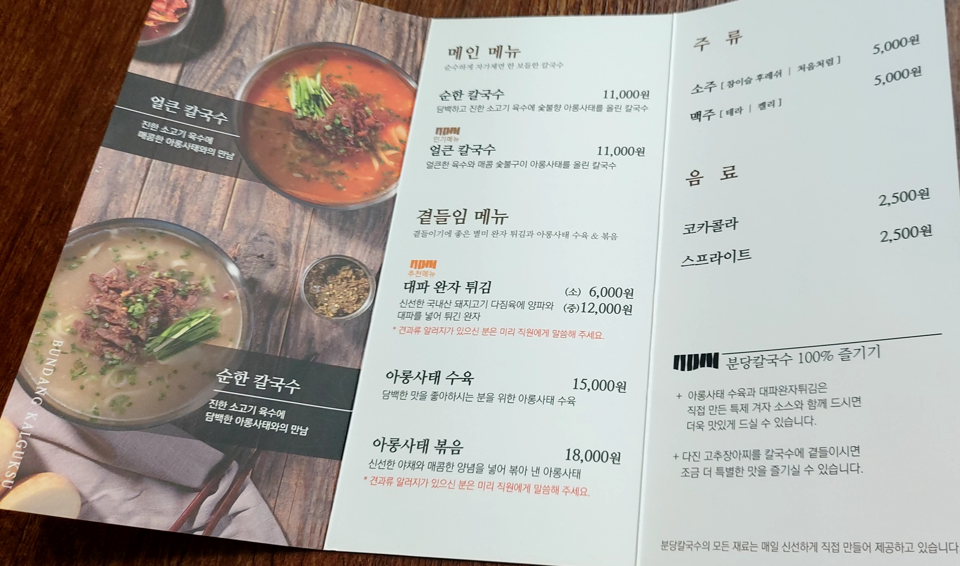 순한칼국수와 얼큰칼국수가 메인 메뉴입니다.