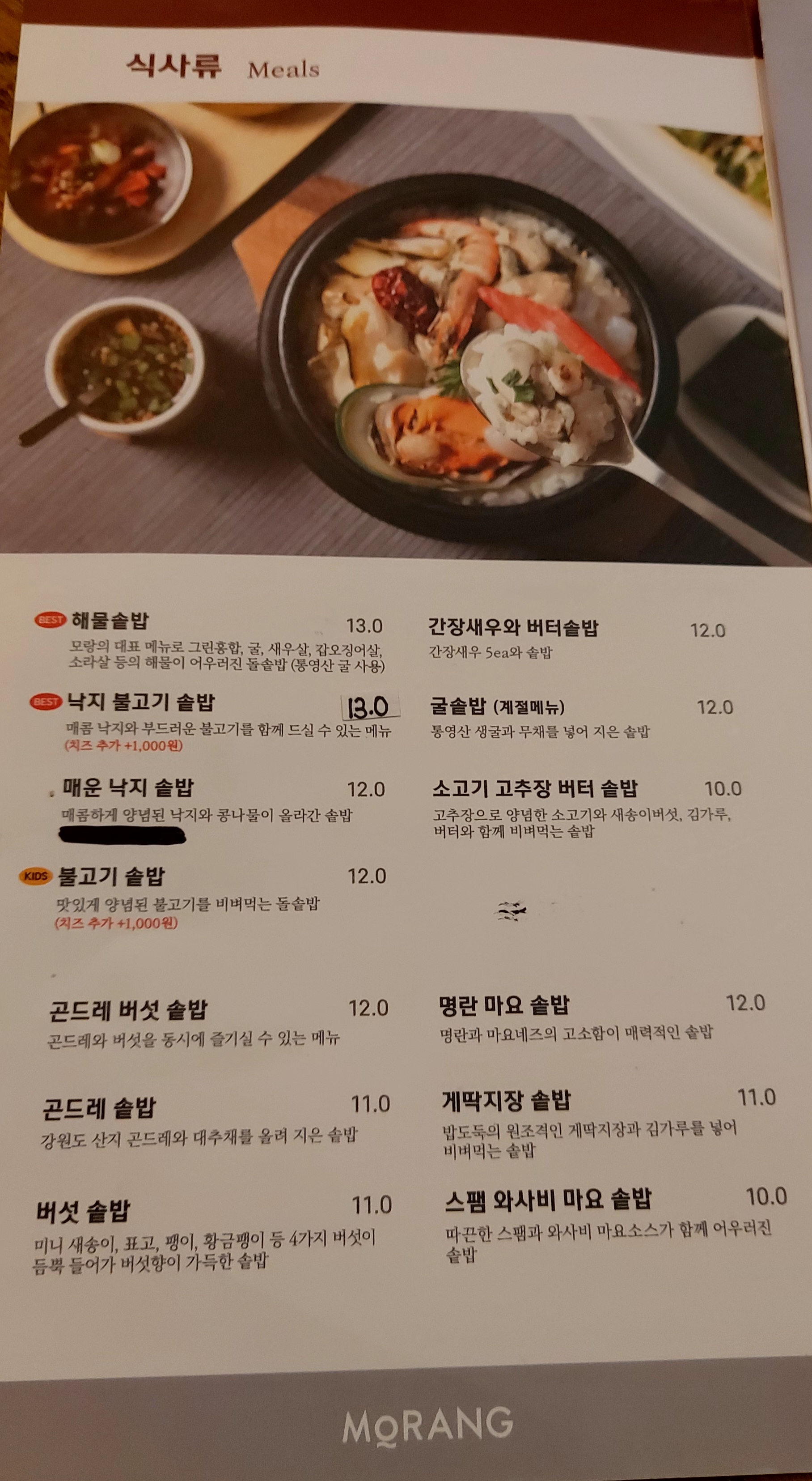베스트 메뉴를 보니 해물솥밥과 낙지불고기솥밥이네요.
