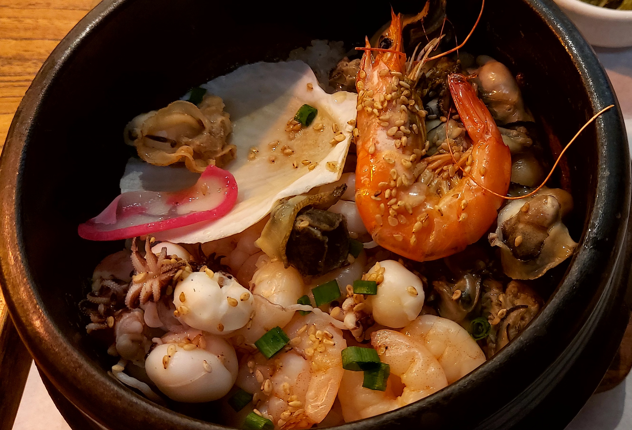 홍합,굴, 새우살,갑오징어살, 소라살 등 푸짐한 해물이 가득 들어있는 바다 내음나는 솥밥이네요.
