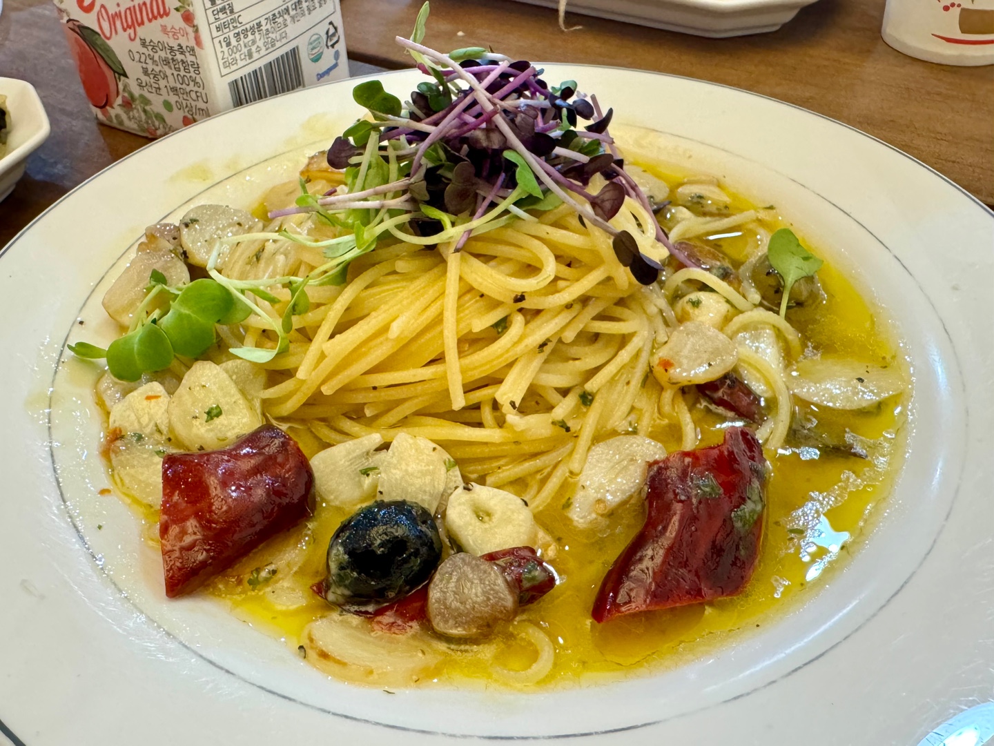 웟층 식당에서 주문한 파스타와 피자입니다.