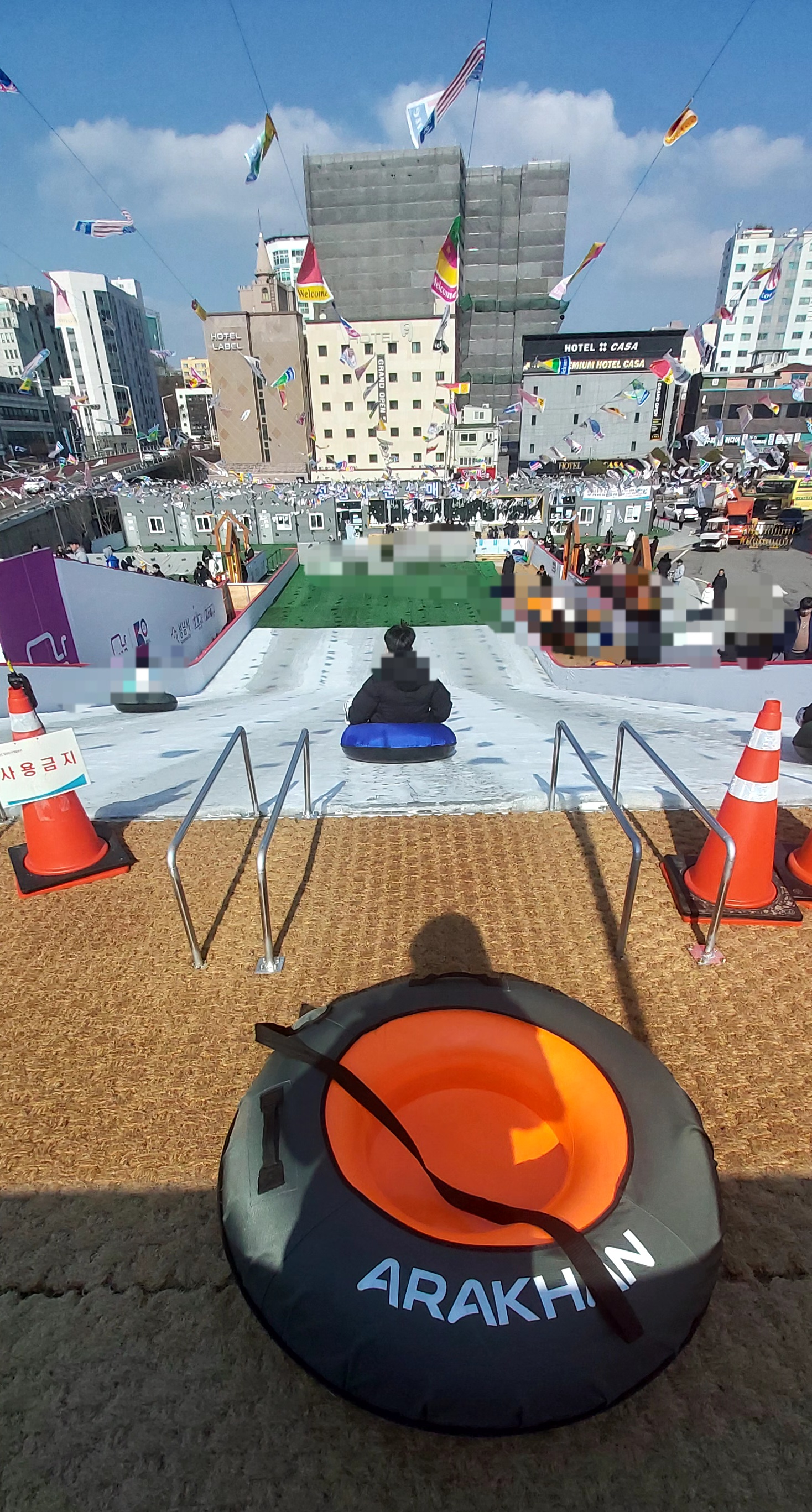 슬로프 입구에서 스텝이 발권시 주었던 손목띠를 검사하고 튜브를 줍니다.