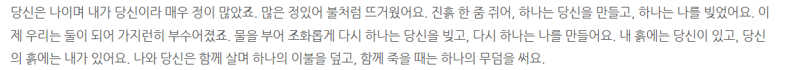 尔侬我侬,忒煞情多,情多处,热似火。把一块泥,捻一个尔,塑一个我,将咱两个,一齐打破,用水调和。再捻一个尔,再塑一个我。我泥中有尔,尔泥中有我。我与尔生同一个衾,死同一个椁!