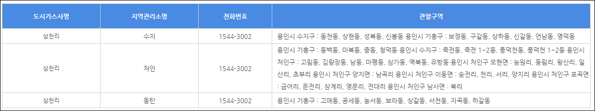 용인 지역은 '삼천리' 도시가스를 사용하네요. 해당 고객센터 번호 참고하세요.
