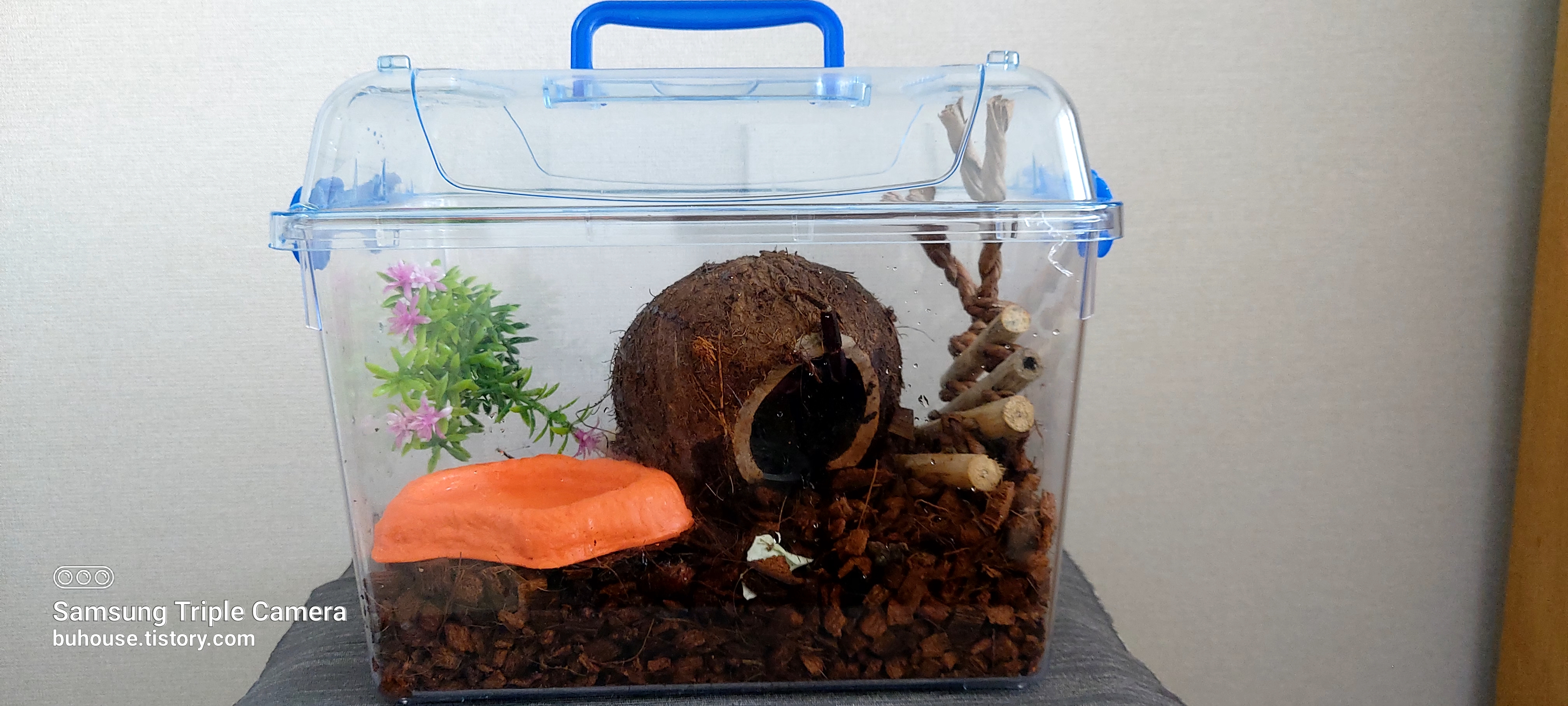 채집통에 집을 꾸며주었어요.